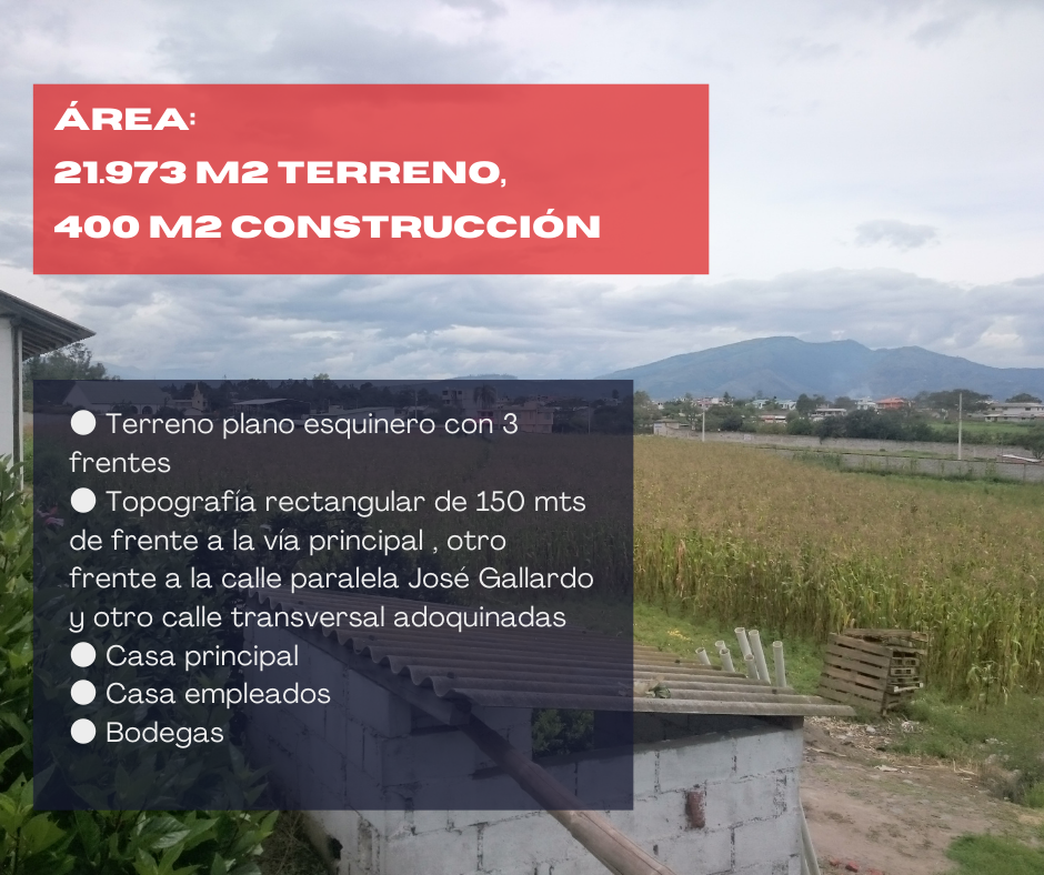 DESCRIPCIÓN: Terreno con tres frentes más casa y bodega UBICACIÓN: Puembo, a 100 mts de la 1era. Cruz de Puembo, calle 24 de Mayo vía a los Arrayanes y José Gallardo CARACTERÍSTICAS: Terreno plano esquinero con 3 frentes Topografía rectangular de 150 mts de frente a la vía principal , otro frente a la calle paralela José Gallardo y otro calle transversal adoquinadas Casa principal Casa empleados Bodegas ÁREA: Terreno Escrituras 20.000 M2, cuerpo cierto 21.973 m2 Construcción: Aproximadamente 400 m2 PRECIO: $2950.000 dólares Atentamente, CBR. Carlos Corella, REALTOR® NRDS. ID. 061234804 NAR Telfs: 0988767601 - 0995469545 Email: carloscorellabroker@gmail.com www.carloscorellabroker.com