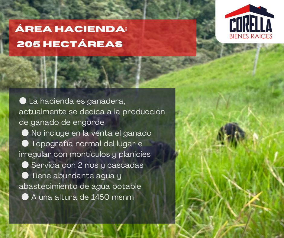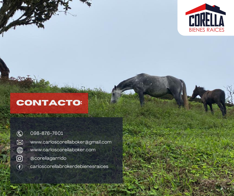 DESCRIPCIÓN: Hacienda ganadera UBICACIÓN: Entre Parroquia Gualéa y Pacto. La Hacienda está ubicada por la vía CALACALÍ, pasa el museo de TULIPE y a 9 Km de distancia pasando LAS TOLAS está la HACIENDA. CARACTERÍSTICAS: • Está a 1 hora 30 minutos de QUITO pasando por la Mitad del Mundo o a 80 km desde Quito • La hacienda es ganadera, actualmente se dedica a la producción de ganado de engorde • No incluye en la venta el ganado • Topografía normal del lugar e irregular con montículos y planicies • Servida con 2 ríos y cascadas • Tiene abundante agua y abastecimiento de agua potable • A una altura de 1450 msnm • Desde Tulipe tomar vía a las Tolas , pasar las Tolas hacia arriba . A 200 metros de donde se termina el adoquinado de las Tolas hay un " T" con un rótulo bien claro ; a mano izquierda dice Pachijal y a mano derecha SAN LUIS ALTO, ir en esa dirección; y a 300 metros de la cancha de San Luis Alto está la la entrada a las Gemelas Desde Tulipe hasta la entrada a las Gemelas son 9 km. ÁREA: 205 hectáreas PRECIO: $1100.000 dólares Contacto: CBR. Carlos Corella, REALTOR Lic. Prof. No.220 ACBIR PICHINCHA NRDS. ID. 061234804 NAR 0988-767601 / 0995-46954
